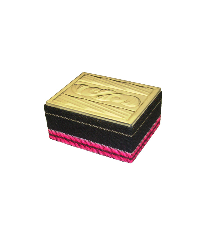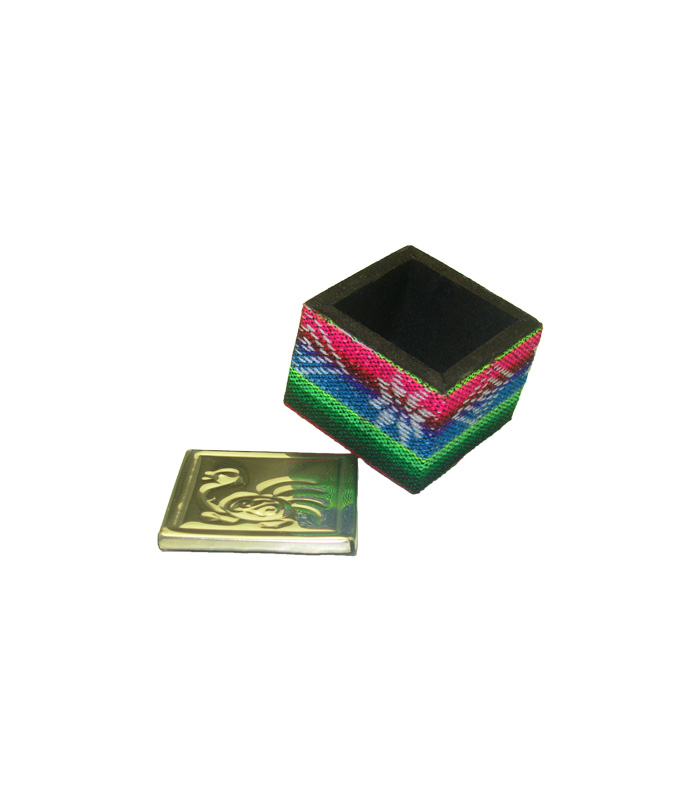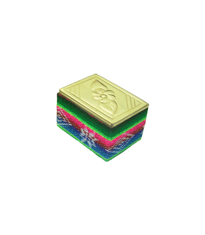 Cajitas forradas en aguayo, con tapa repujada de alpaca.
