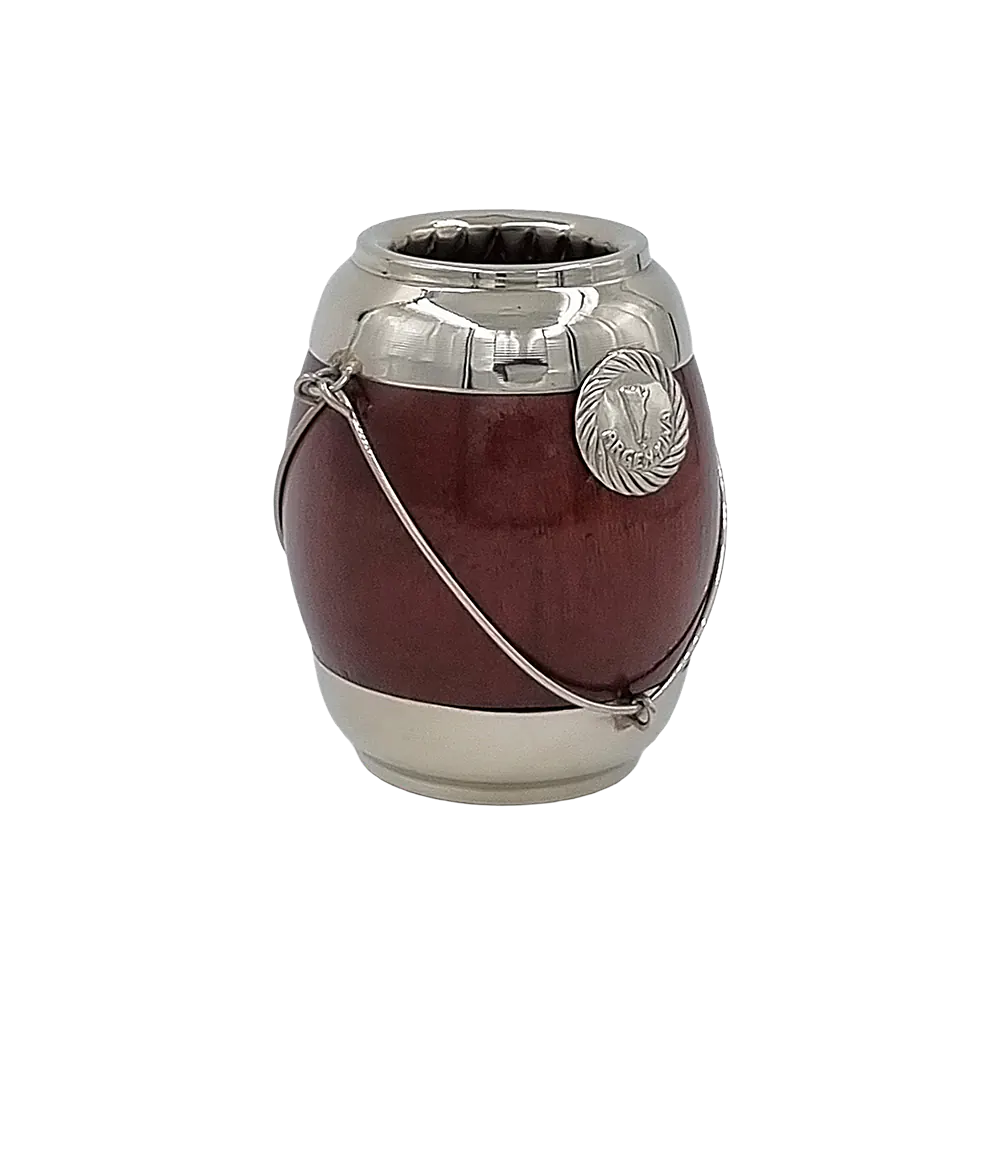 Mate de madera de Caldén con virola, base y dije de alpaca. Lustrado y con la virola sellada.