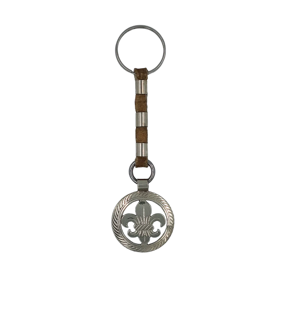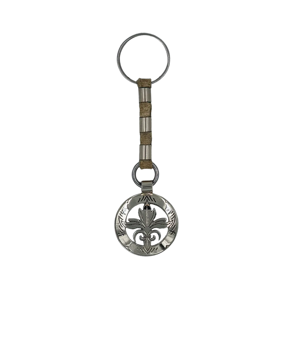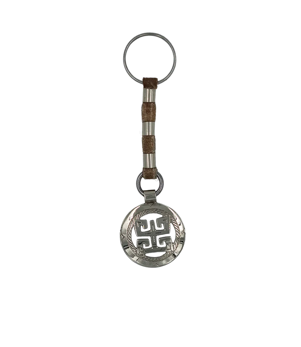 Llavero de cuero entacado. Medalla, argolla y pasadores de alpaca.