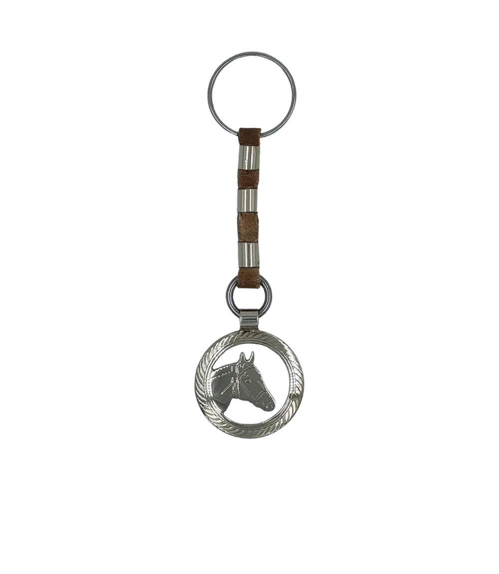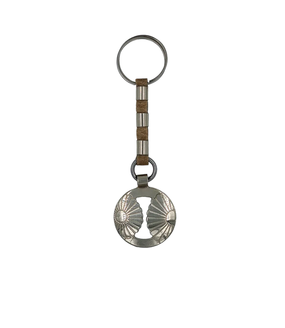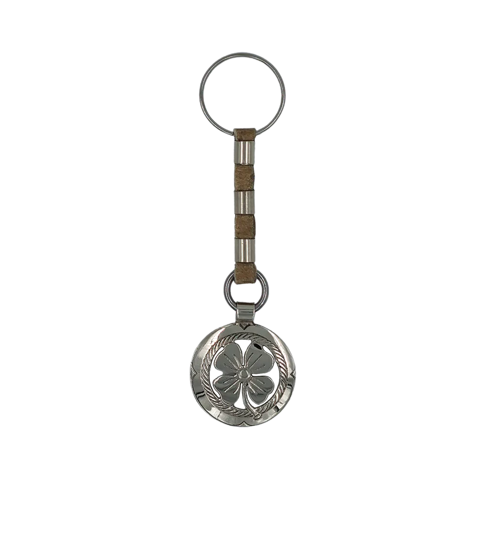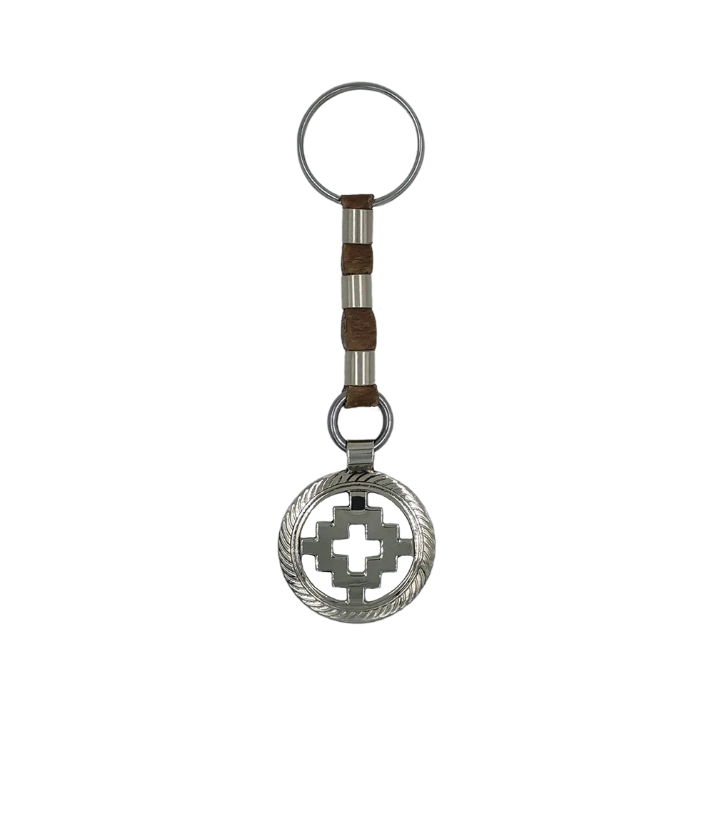 Llavero de cuero entacado. Medalla, argolla y pasadores de alpaca.
