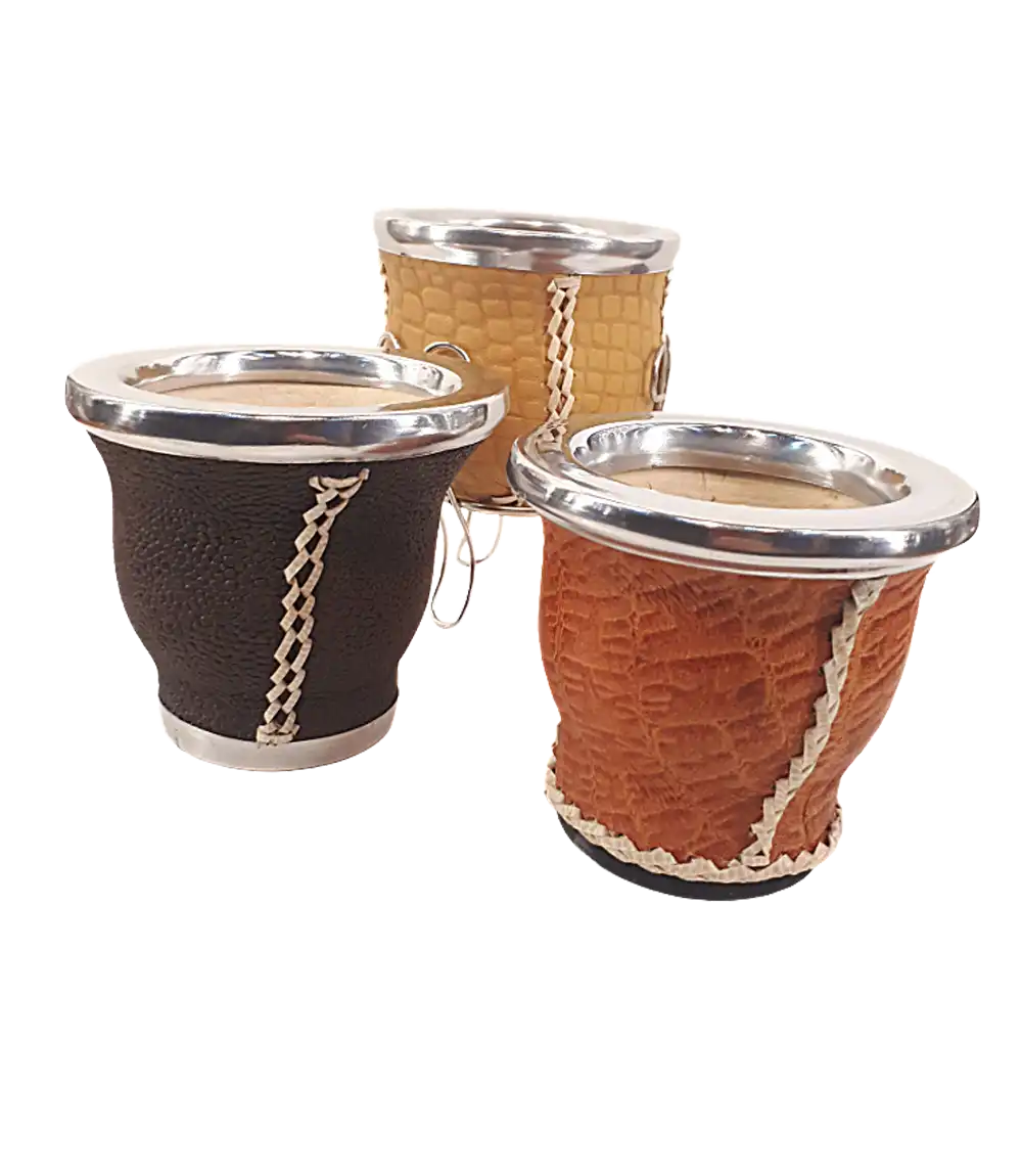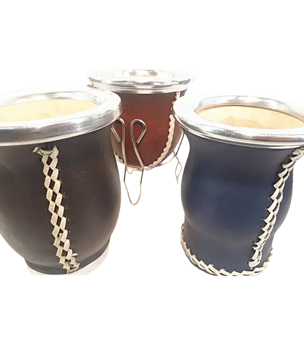 Mate de calabaza porongo, revestido en cuero vacuno y cocido en tiento. Copita o con patas de alambre.