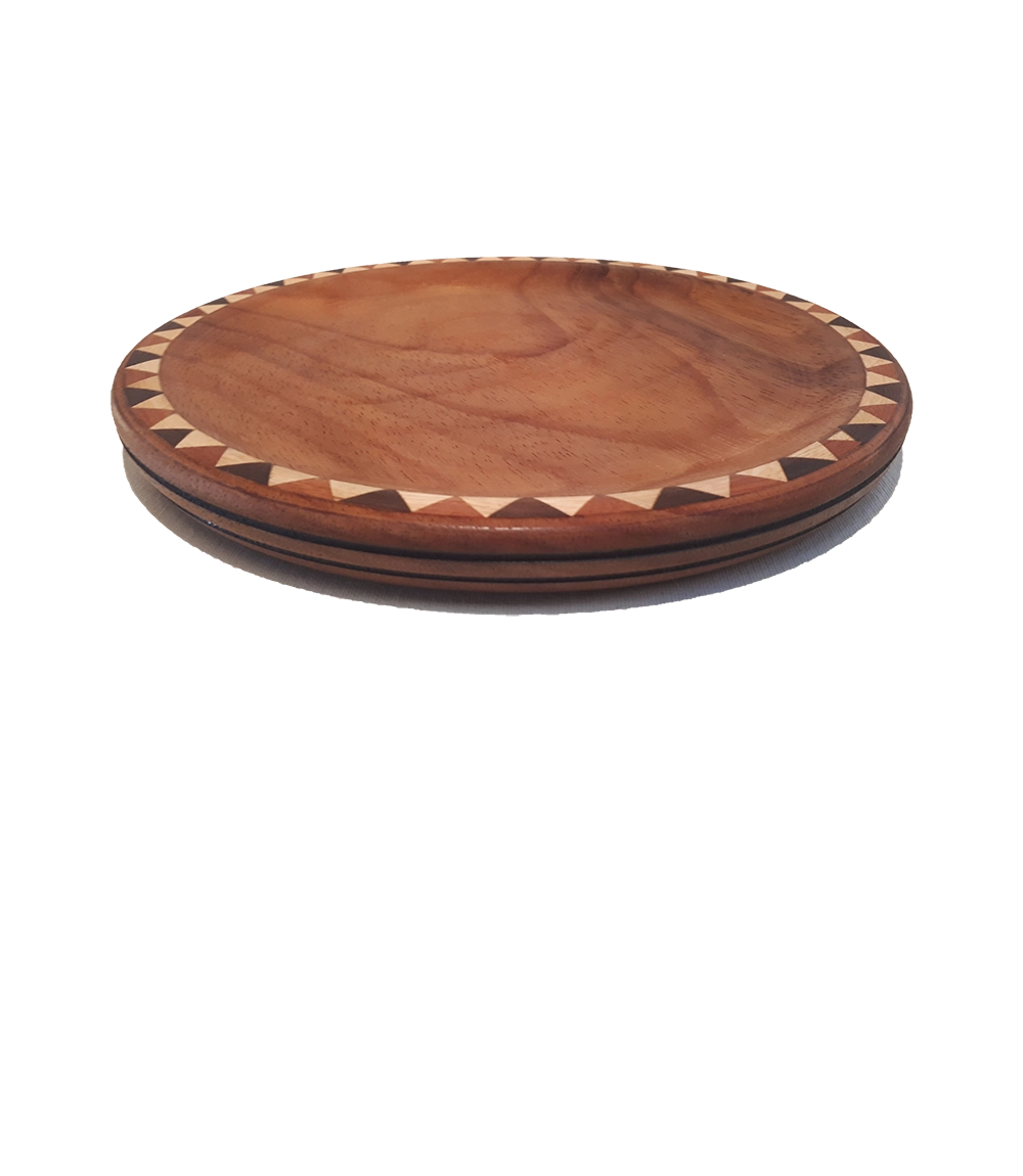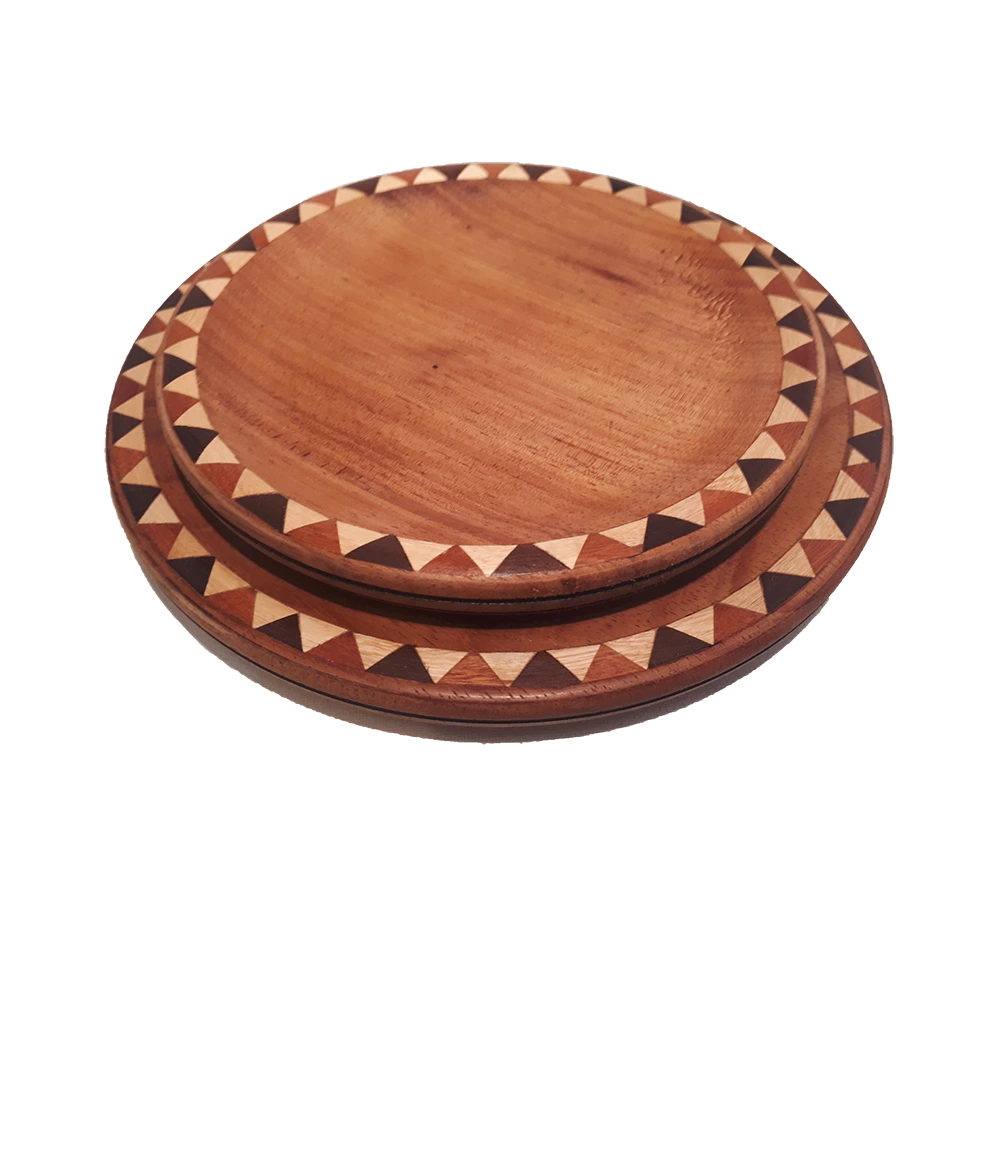 Centro Redondo de madera pacará. Curada con cera de abeja, lista para su uso. Detalle de taraceado.